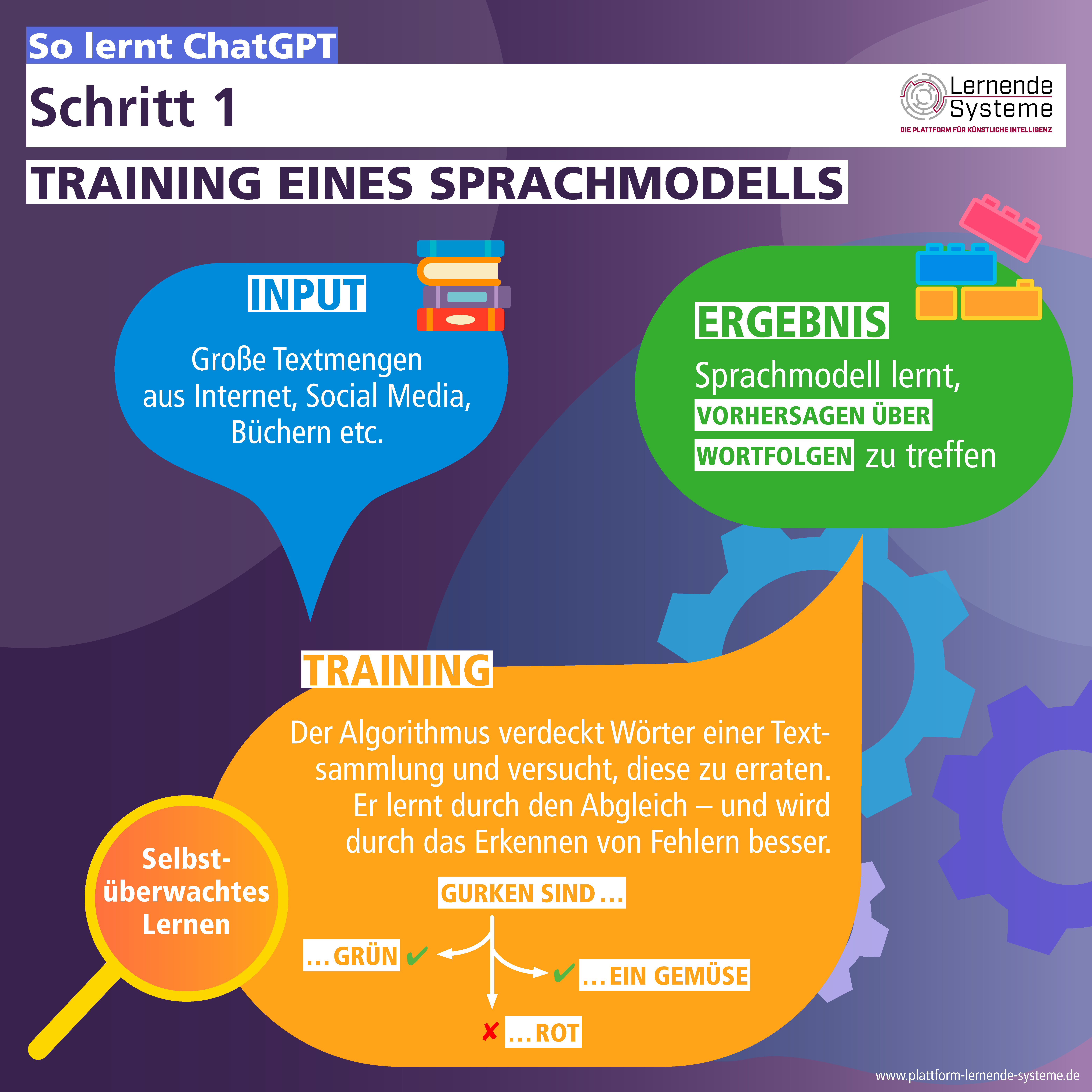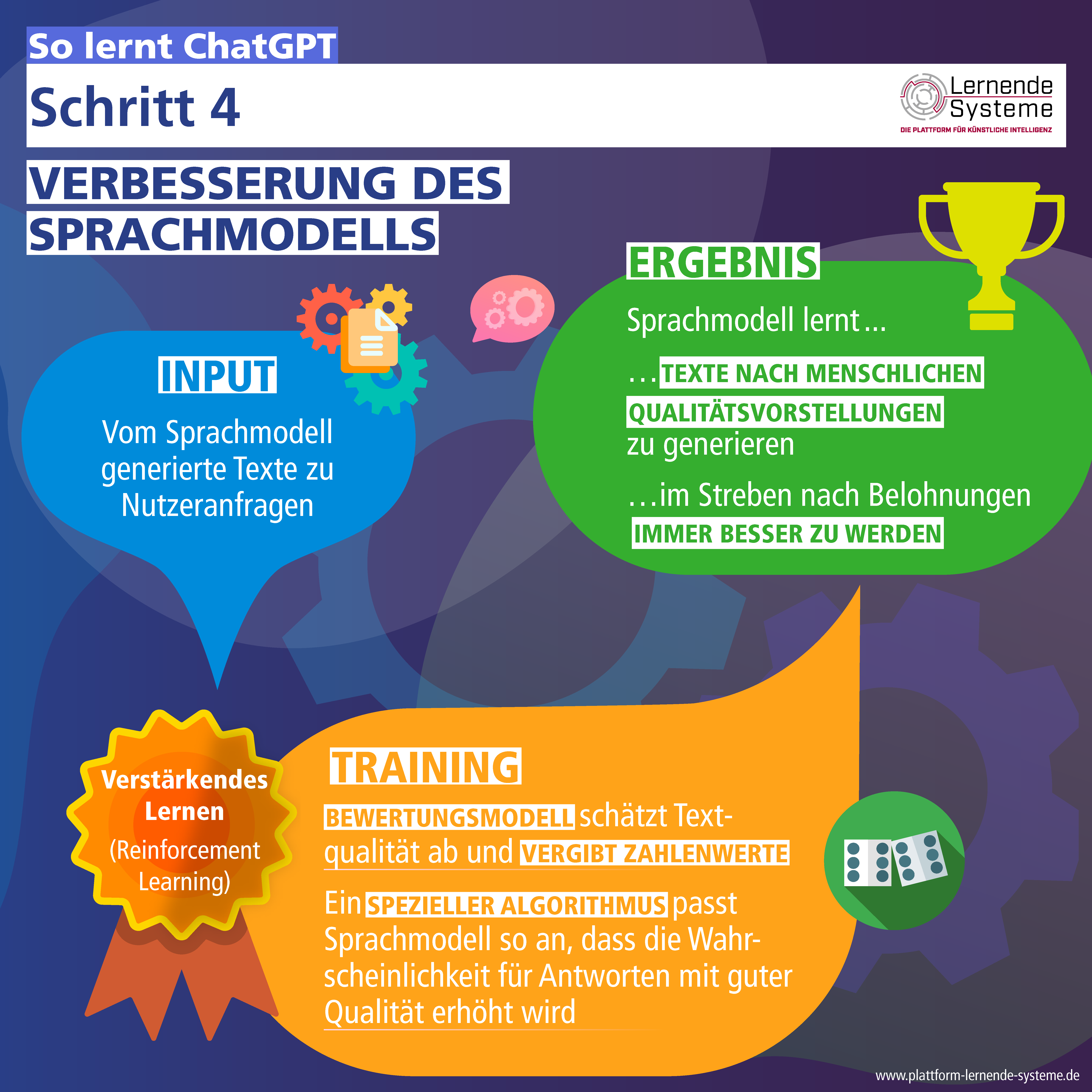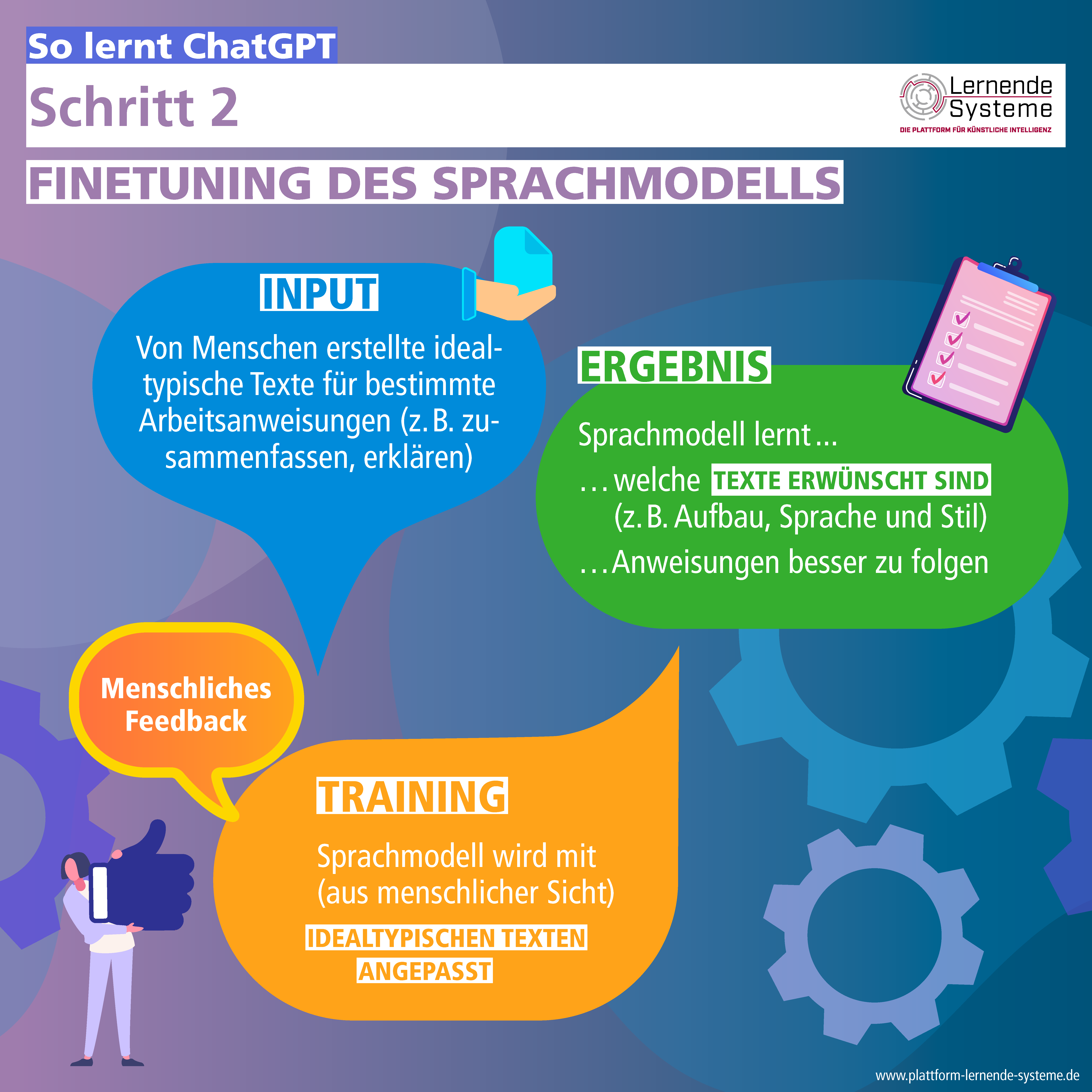 Seit Veröffentlichung von ChatGPT im November 2022 staunen weltweit Millionen von Nutzerinnen und Nutzern über die eloquenten Texte, die das Sprachmodell auf Anfrage generiert. Doch Vorsicht: Nicht alles, was die KI-basierte Software selbstbewusst von sich gibt, ist korrekt. Wie funktioniert ChatGPT? Wie lernt das System? Die Infografiken der Plattform Lernende Systeme liefern eine knappe, verständliche Erklärung. Vorweg: Der Mensch spielt beim Training von ChatGPT eine wichtige Rolle.